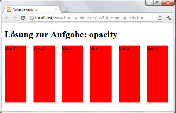 Noch fehlt die CSS3-Anweisung opacity für die Deckkraft. Diese soll für jede einzelne Box unterschiedlich sein - daher wird diese den einzelnen IDs entsprechend zugewiesen.